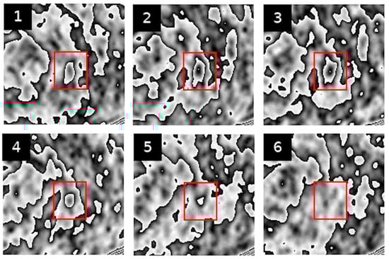Result of the transformation of PET image sequences using the PCUL-FDG method. The red square indicates the site of a malignant hypermetabolic pulmonary nodule (Figures 1–6 show successive slices of a lung nodule).