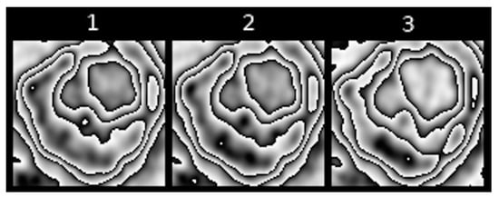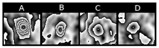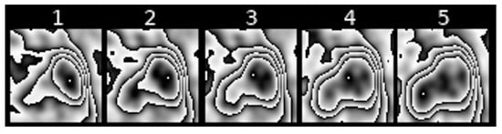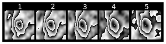 Feature 4 refers to the number of contours nested one within another in the pulmonary nodule. The highest degree of nesting present in the entire PET sequence is taken as the value of the feature. This is a visual representation of the degree of metabolic variability of an analysed pulmonary nodule. Figure 4 represents nesting of contours that is typical of various PET images.