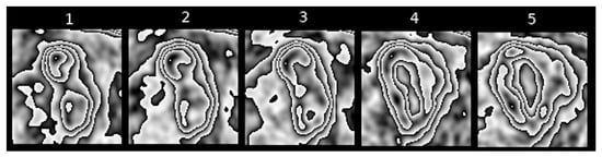 Feature II refers to the extent to which the shape of [18F] FDG uptake contours is altered in the subsequent sequences of transformed PET images of pulmonary nodules. Figure 5, Figure 6 and Figure 7 present different stages of alterations in the shape of these contours.