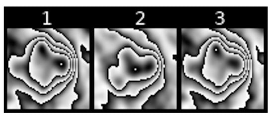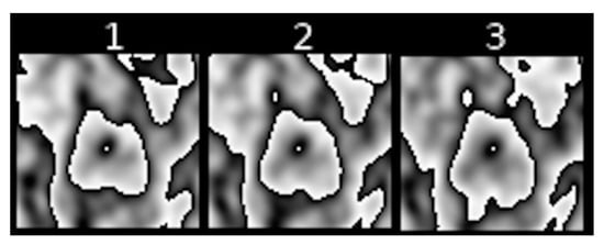 Feature III refers to the change in the location of the area with maximum [18F] FDG uptake within the contour that surrounds it in subsequent scans of transformed PET images of pulmonary nodules. Figure 8, Figure 9 and Figure 10 show examples of such shifts in the location of maximum uptake.