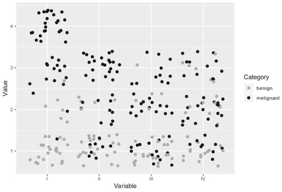 Each image of a pulmonary nodule transformed by means of PCUL-FDG was described in terms of the four above-mentioned features, which are referred to as diagnostic variables for the purposes of this analysis. The values of the diagnostic variables were determined based on weighted ordinal scales. The weights were determined a priori on the basis of preliminary analysis of the values of particular features with respect to their informative richness. As can be seen in Figure 12, variables I and II have widely varying values within both studied groups. Therefore, it can be assumed that they have a higher informative potential when comparing transformed images.