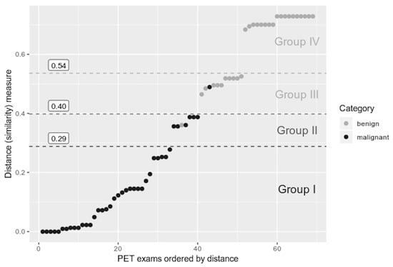 - Group I—distance from pattern object in the range of 0–0.29—lesions with distinct, prevalent features of a malignant tumour (33 cases of malignant tumours, i.e., 82.5% of all the cases of malignant tumours under consideration);