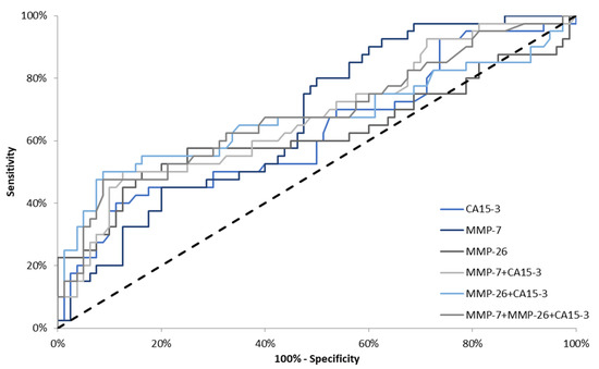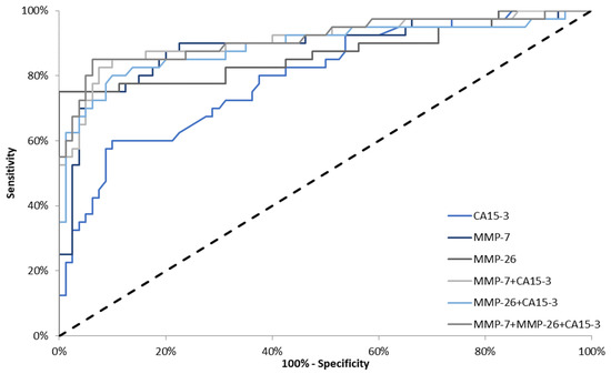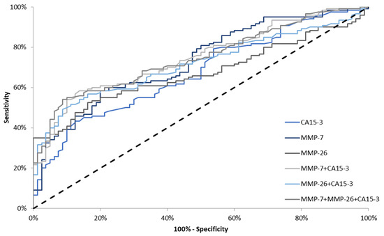 Diagnostic criteria of ROC curve in total breast cancer (BC) group. CA 15-3—cancer antigen 15-3; MMP-7—matrilysin-1; MMP-26—matrilysin-2.