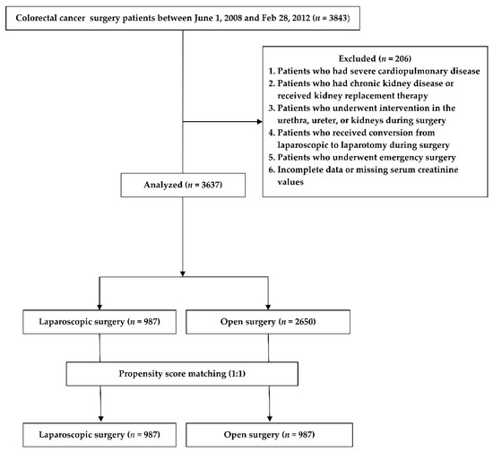Colorectal cancer (CRC) is the third most common cancer in men and the second most common cancer in women globally, with an annual incidence of about 40 in 100,000 [6]. Surgical treatment plays an important role in colon cancer management and is largely divided into two types: open and laparoscopic. Laparoscopic surgery is well known for resulting in minimal trauma, less bleeding, and more stable hemodynamics in surgical patients [7,8]; moreover, these factors might reduce postoperative acute renal injury [9]. Previous studies have reported lower rates of postoperative AKI for laparoscopic surgery than for open surgery [10,11]. However, few studies have assessed the effect of laparoscopic CRC surgery on postoperative AKI.