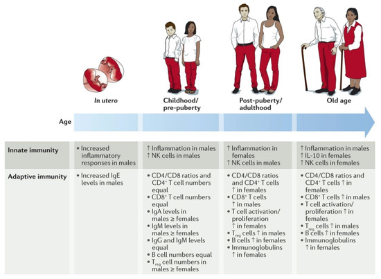 As reviewed extensively by Klein et al., numerous studies have shown remarkable sex disparities regarding the activities of the innate and adaptive immune systems (Figure 1) [26].