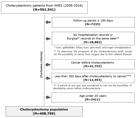 Jung, Y.K.; Yoon, J.; Lee, K.G.; Kim, H.J.; Park, B.; Choi, D. De Novo Cancer Incidence after Cholecystectomy in Korean Population. J. Clin. Med. 2021, 10, 1445. https://doi.org/10.3390/jcm10071445