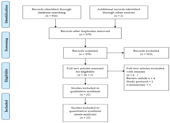 The articles search of the online databases yielded 916 articles. We excluded 537 duplicate articles and 353 articles were excluded after reviewing the titles and abstracts. We further examined 26 full-text articles and searched the references of relevant articles, retrieving 2 additional publications. Finally, 22 studies met all inclusion criteria [1,9,10,15,16,17,18,19,20,21,22,23,24,25,26,27,28,29,30,31,32,33]. The flow diagram of the systematic articles search is presented in Figure 1.
