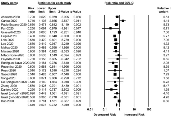 Our meta-analysis consists of 22 studies with COVID-19 participants. Statin use was associated with a significantly decreased risk of mortality among patients with COVID-19 (RR adjusted = 0.64; 95% CI: 0.57–0.73, p < 0.001) (Figure 2). The heterogeneity among the studies was moderate and significant (I2 = 74.96, Q = 87.86, and τ2 = 0.04).