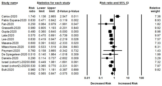 We pooled 14 studies in order to evaluate the impact of statin use before admission and the risk of mortality among patients with COVID-19. The pooled risk ratio of mortality was 31% lower in statin users than that of without statin users (RR adjusted = 0.69; 95% CI: 0.56–0.84; I2 = 75.89%) (Figure 3).
