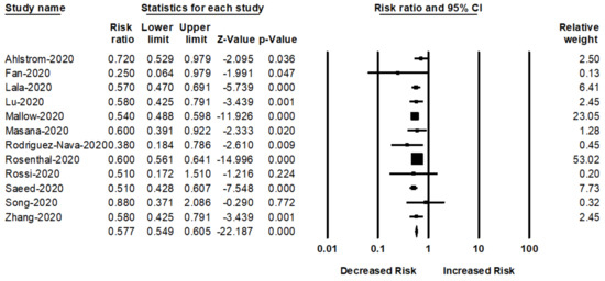 We pooled 11 studies in order to evaluate the impact of statin use after admission and the risk of mortality among patients with COVID-19. The pooled risk ratio of mortality was 43% lower in statin users than that of without statin users (RR adjusted = 0.57; 95% CI: 0.54–0.60; p < 0.001) (Figure 4). There was no heterogeneity among the studies (I2 = 5.63, Q = 10.59, and τ2 = 0.001).