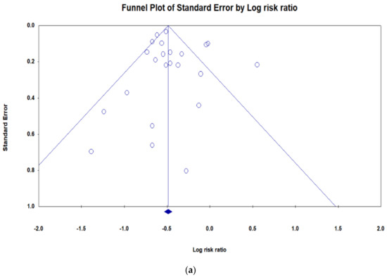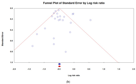 Figure 5a shows the funnel plot clustering of studies. Egger’s test confirmed asymmetry of the funnel plot (0.61; 95% CI: −0.88, 1.69; p = 0.51) and shows no publication bias. Figure 5b shows the funnel plot with missing studies imputed by the trim-and-fill method. There was no missing study to be filled in the plot, and the overall log risk ratio became 0.61 95% CI (0.58–0.64).