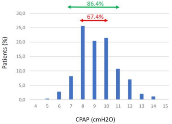 Treating some patients with a pressure clearly below optimal value could translate into the presence of residual events (snoring, flow limitation, or mild hypopneas) and a potentially less favorable mitigation of symptoms, and thus adherence, or not fully reducing the risk of cardiovascular consequences of OSA. However, most detrimental events such as apneas and severe hypopneas would disappear. Conversely, those patients receiving a CPAP pressure that is higher than the individually derived optimal one would be “overtreated” with a pressure setting of 9 cmH2O. A nasal pressure that is set a few cmH2O above the ideal one is unlikely to be detrimental (e.g., for cardiac output), and would scarcely impact on patient comfort and thus adherence. More importantly, in this situation, all the patient’s respiratory events would be eliminated. We should emphasize that the potential drawbacks resulting from deviating from “ideal” CPAP by ±2–3 cmH2O would be certainly acceptable if the alternative was no CPAP treatment because of the lack of financial resources or logistical infrastructure permitting implementation of the conventional CPAP titration. Clearly, the proposed setting of 9 cmH2O is not written in stone. Although it seems suitable for covering 86.4% of patients (within a ±2 cmH2O range) in a general population of OSA patients (Figure 1), the initial CPAP figure could be moved to 10 cmH2O to reduce potential residual effects in some additional patients. It also could be further increased in specific subsets of patients in whom previous experience and their characteristics would predict that they require higher CPAP therapeutic pressures (e.g., in morbid obesity or when using a facial mask [27]).