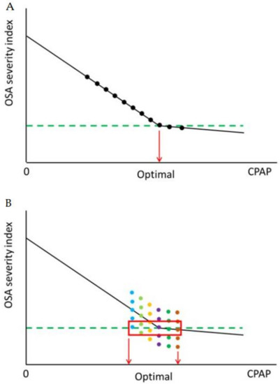Interestingly, the financial resources and professional efforts eventually spared by avoiding CPAP titration in most OSA patients (only a minority of complex patients or those situated in the edges of the Gaussian distribution shown in Figure 1 would require individualized assessment after initial CPAP trial) could be reinvested into OSA patients; for instance, to expand the access to diagnose the disease, which is also a costly procedure [7], or to implement programs aimed at improving CPAP patient’s adherence [28,29].
