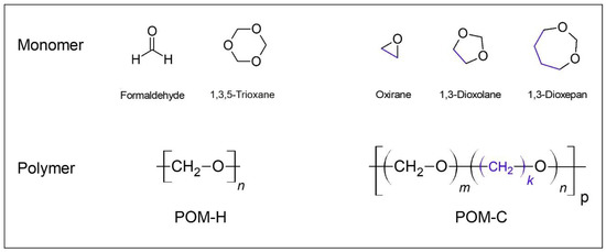 Patients demand metal-free and tooth-colored dental restorations for multiple reasons, including sensitivity to alloy components, fear of intoxication, or esthetical reasons. In fixed dental prostheses (FDP), zirconium dioxide is a potent alternative to classic veneered alloys. However, in removable dental prostheses (RDP), metal frameworks are still the gold standard. Polyoxymethylene (POM) is a material able to provide tooth-colored esthetics and that is suitable for fabrication of frameworks for RDPs. POM can be characterized as both polyethers (-C-O-) as well as polyacetals (-O-C-O-) [1]. Two formulations of POM are available: the polyoxymethylen homopolymer (POM-H) and copolymer (POM-C). POM-H can be fabricated either from formaldehyde monomers or from trioxane monomers [1]. POM-H is a highly crystalline thermoplastic material with a helical structure [1,2]. For the formulation of POM-C, small amounts of other cyclic ethers (-C-O-) featuring additional methylene groups are added (Figure 1) [3,4]. The additional methylene groups result in higher thermal and hydrolytic stability, which improves its resistancy against polymer chain degradation [5].