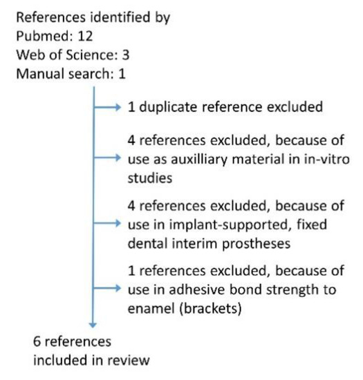 In scientific dental literature, only little information regarding POM is currently available. Electronic MEDLINE/PubMed and Web of Science searches were performed by using the terms “polyoxymethylene” AND “dentistry” including results from 2010 until 27 January 2021. The exclusion criteria for the search were defined as use in tooth-supported or implant-supported FDP. Moreover, publications focusing on the adhesive bond strength of POM to tooth tissues were excluded (Figure 2). In total, 15 publications were identified by the literature search, which was amended by an additional manual search that retrieved one more reference [12].