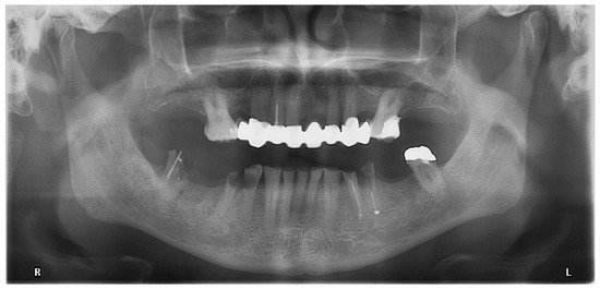 In September 2019, two implants (Screw-Line Promote Plus 4.3 mm, Camlog, Wimsheim, Germany) were inserted in the area of the lower first molars. At the end of the pre-treatments, following three options for final prosthetic rehabilitation of the lower jaw were discussed with the patient in detail: