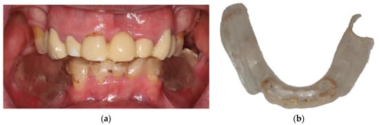 After extraction of the teeth (May 2019), a splint replacing the missing lower teeth was fabricated from translucent methyl methacrylate-free resin (CLEARsplint®, Astron Dental, Lake Zurich, IL, USA) (Figure 5).