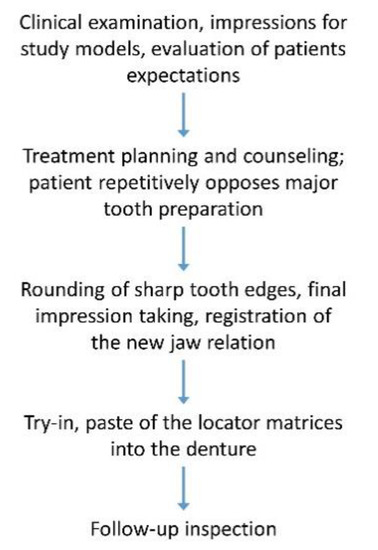In spring 2019, a 69-year-old male patient introduced himself at the Department of Prosthodontics and Materials Science at Leipzig University (Leipzig, Germany). He described functional impairment related to the orofacial system. However, he was pleased with esthetics and function of the denture in the upper jaw fabricated three years ago. The patient asked for a metal-free prosthetic rehabilitation in the mandible and a minimally invasive treatment approach. Regarding general health, he reported about neurodermatitis, chronic obstructive pulmonale disease, and the insertion of a stent implant in the coronary arteries in 2017.