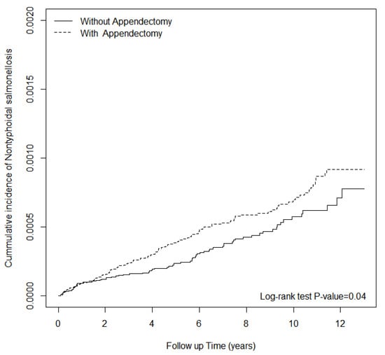 The cumulative incidence of hospitalized NTS infection for patients with and without appendectomy.