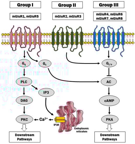Eight genes (GRM1 to GRM8) encoding mGluRs (mGluR1 to mGluR8) have been cloned and characterized, with multiple splice variants that are expressed in different cell types in the central and peripheral nervous system [,]. Up to date, the genetic loci for each receptor have been identified as well []. The mGluRs are divided into three groups I, II and III based on receptor structure, ligand selectivity and physiological action (Table 1). Group I includes mGluR1 and mGluR5, and their activation triggers phospholipase C-mediated effects. Group II, which includes mGluR1 and mGluR3, and group III involving mGluR4,6,7,8, are coupled to the inhibition of cAMP signaling via Gi/Go protein (Figure 1). In general terms, these receptors play a modulatory role by regulating neurotransmitter release, excitability, and synaptic plasticity. All glutamate receptors discussed here, except for mGluR6, which is primarily located in the retina, are expressed in neurons and glial cells. However, their distribution in cell subtypes may vary depending on the receptor.