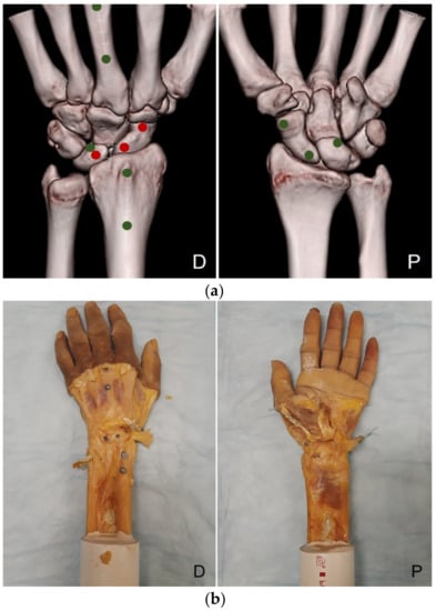 - Athlani, L.; Pauchard, N.; Dautel, G. Radiological evaluation of scapholunate intercarpal ligamentoplasty for chronic scapholunate dissociation in cadavers. J. Hand Surg. Eur. Vol. 2018, 43, 387–393. [Google Scholar] [CrossRef] [PubMed]