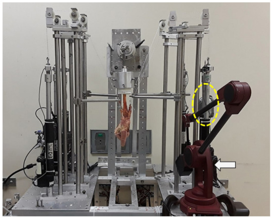 Specimens were tested using a custom wrist testing system designed to obtain carpal kinematic measurements. With the weights applied (yellow dotted circle), each wrist reached the maximum excursion that could be achieved in the desired wrist direction. The kinematic measurements were taken by digitizing the marker positions using a MicroScribe 3D digitizer (white arrow).