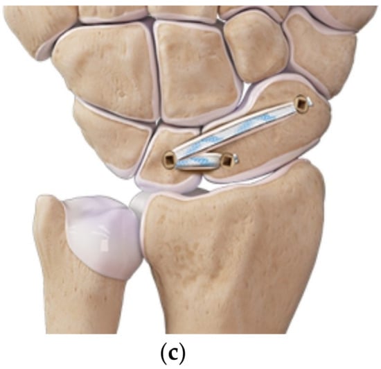 - Henry, M. Reconstruction of both volar and dorsal limbs of the scapholunate interosseous ligament. J. Hand Surg. Am. 2013, 38, 1625–1634. [Google Scholar] [CrossRef]