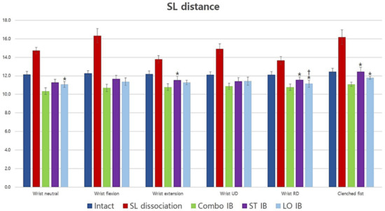 Average scapholunate distance for all conditions and positions (mm). Short-transverse and long-oblique IB had similar effects; however, both were less effective than Combo IB. *: Statistically significant difference compared to Combo IB (p < 0.05), †: Statistically significant difference compared with short-transverse IB (p < 0.05). SL: scapholunate; UD: ulnar deviation; RD: radial deviation; Combo: combination; IB: internal bracing; ST: short-transverse; LO: long-oblique.