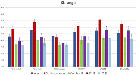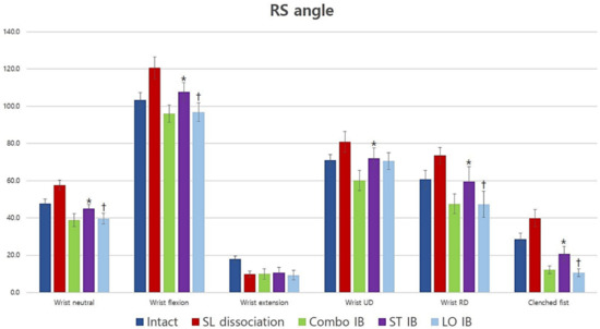 The average radioscaphoid angle for all conditions and positions (degrees). Short-transverse IB had less effect than long-oblique and Combo IB; however, long-oblique and Combo IB had similar effects. *: Statistically significant difference compared to Combo IB (p < 0.05), †: Statistically significant difference compared with short-transverse IB (p < 0.05). SL: scapholunate; UD: ulnar deviation; RD: radial deviation; Combo: combination; IB: internal bracing; ST: short-transverse; LO: long-oblique.