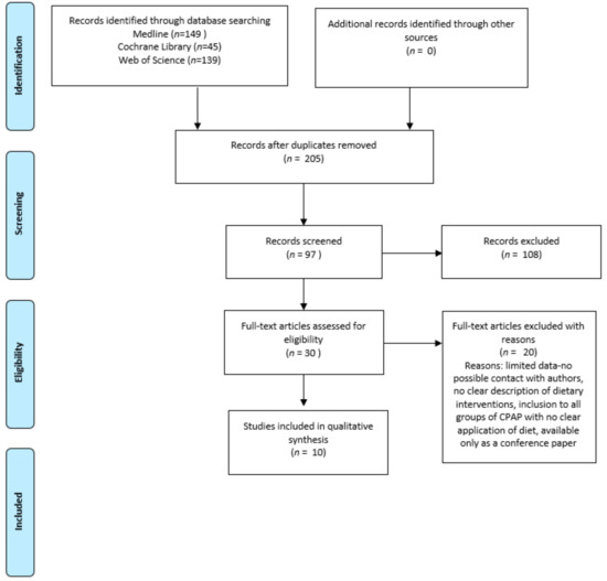 The search strategy was restricted to humans, English language and original articles. The search was based upon the following index terms and titles: #1, sleep or apnea or obstructive sleep apnea or obstructive sleep apnea or sleep-disordered breathing and #2, diet or dietary intervention or diet, fat-restricted or energy intake or energy reduction and #3, weight loss or weight and #4, insulin or insulin resistance or insulin-secreting cells or glucose or lipids or triglycerides or cholesterol, and not animals. The PRISMA Statement was followed [18].
