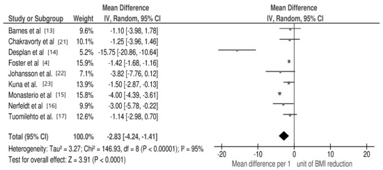 The quantitative meta-analysis revealed a significant decrease in AHI per 1 unit of BMI change (mean difference: −2.83/h; 95% CI: −4.24, −1.41; p < 0.00001, I2 = 95%) (Figure 2).