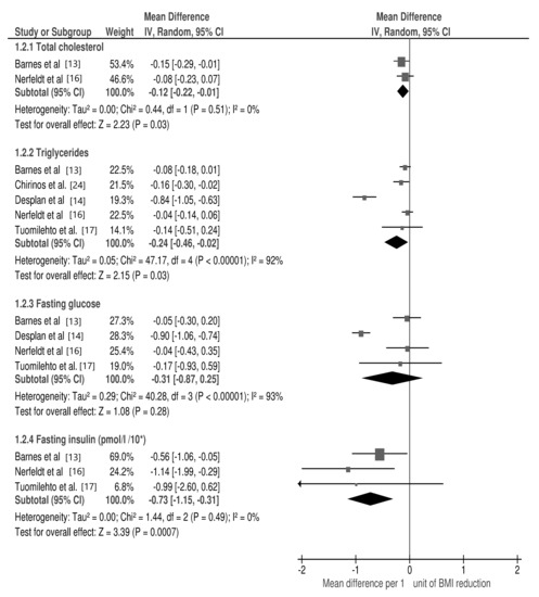 When possible, the recorded Glc, TC and TG concentrations were converted to mmol/L and insulin concentration to pmol/L in order to standardize the results. A meta-analysis was performed to combine the results of the individual studies. Data were analyzed using a random-effects model, which allowed for true effect variation between studies. The effect size of a study was investigated by calculating mean difference per unit of BMI reduction (treated as an objective measurement of body weight change) with a 95% confidence interval.