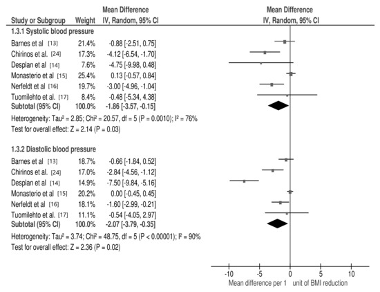 Forest plot for mean cardio-metabolic parameter changes in subgroup analysis: systolic and diastolic blood pressure per 1 unit of body mass index (BMI) reduction in selected studies.