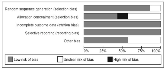 The risk of bias for RCTs [4,13,15,17,21,23,24] is summarized in Figure 5 indicating mainly low risk or unclear risk. A high risk of bias was recognized for allocation in one study only [21]. For NRS, the Newcastle–Ottawa scale was applied and the mean score was 7 [12,16,22].