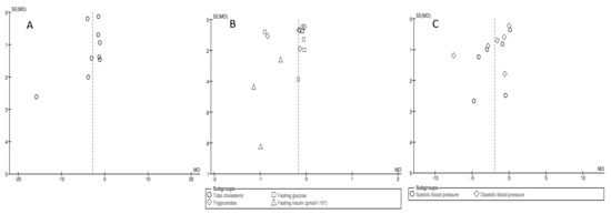Funnel plot of standard error by standard differences in means of: (A) apnea–hypopnea index, (B) total cholesterol, triglycerides, glucose and insulin, (C) systolic and diastolic blood pressure in selected studies per unit of body mass index reduction.