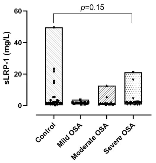 Plasma sLRP-1 levels were significantly lower in the OSA group compared to the controls (1.67 (0.90–2.11) mg/L vs. 1.99 (1.53–3.51) mg/L; p = 0.04; Figure 1). However, the difference between the severity groups was not significant (p = 0.15, Figure 2).