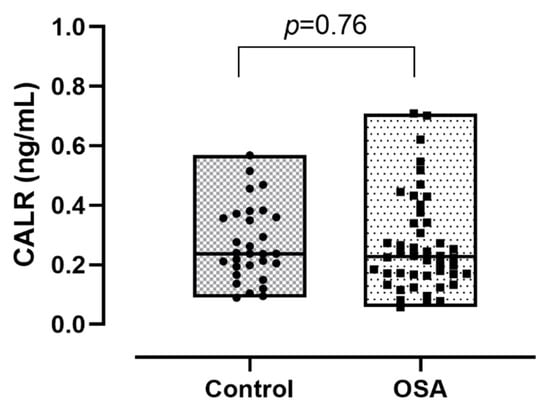 Calreticulin (CALR) concentrations between the control and obstructive sleep apnoea (OSA) group. Data are presented with median, minimum and maximum values.