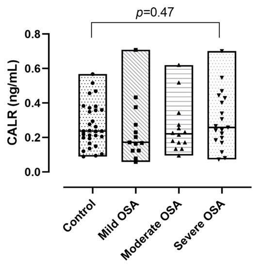 Calreticulin (CALR) concentrations between the severity groups of obstructive sleep apnoea (OSA). Data are presented with median, minimum and maximum values.