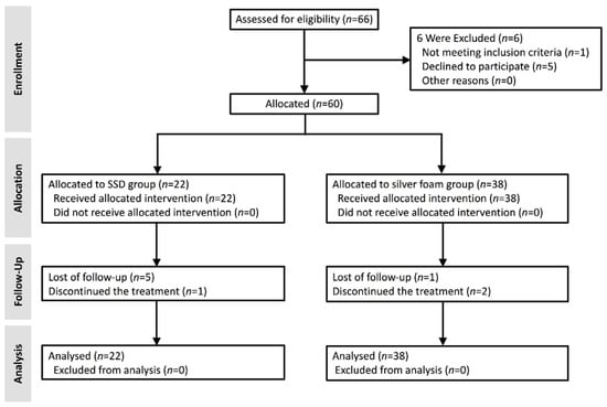 CONSORT flow diagram of the study. Six of the 66 diabetic foot ulcer (DFU) patients were excluded from the trial and 60 patients were included. Of the 22 participants in the 1% silver sulfadiazine (SSD) group who were included in the analysis 1 patient stopped the treatment, and 5 patients were lost to follow-up. Of the 38 participants in the silver foam group, all 38 were included in the analysis, 2 patients discontinued the treatment, and 1 patient was lost to follow-up.