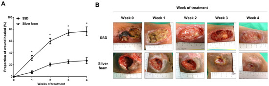 Silver foam dressing facilitated the DFU healing as compared with the SSD dressing. (A) The proportion of the wound healed was demonstrated by the percentage of the wound area reduction (week 1, week 2, week 3, and week 4) from the initial wound area at enrollment (week 0). * p-value < 0.05. (B) The serial follow-up of the patients who received adequate debridement and wound care with the SSD dressing ((B), upper panel) and silver foam dressing ((B), lower panel) in week 1, week 2, week 3, and week 4 of the treatment.