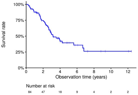 Kaplan-Meier survival curves in the total cohort of idiopathic PPFE. Overall survival of the 84 patients with idiopathic PPFE. Survival at 5 and 10 years was 38.5% and 26.1%, respectively.