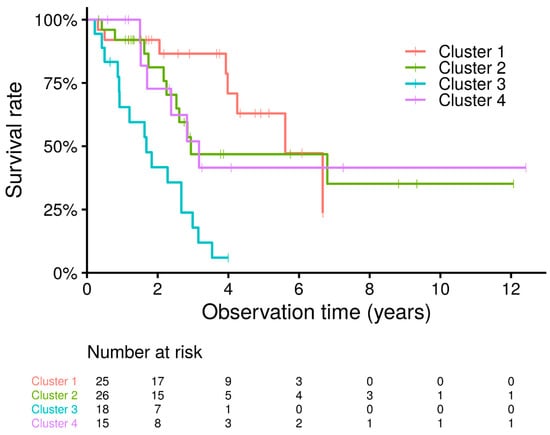 Kaplan–Meier survival curves according to idiopathic PPFE phenotypes. Survival of cluster 3 is significantly worse than that of the other clusters (cluster 3 vs. cluster 1, p < 0.001; vs. cluster 2, p = 0.0041; vs. cluster 4, p = 0.0155). No differences were found between clusters 1, 2, and 4 (cluster 1 vs. cluster 2, p = 0.4206; vs. cluster 4, p = 0.3515; cluster 2 vs. cluster 4, p = 0.9774).