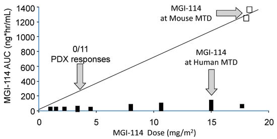Relative systemic exposures to MGI-114 (acylfulvene) in mice and human. Human and mouse pharmacokinetic data are from Eckhardt et al., 2000 [], and Leggas et al., 2002 [], respectively. The AUC (estimated) at the dose of MGI-114 where all 11 PDX models progressed on treatment is shown by the left vertical arrow.