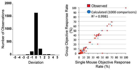 Left: Distribution of deviation for 2134 observations. Single mouse prediction of response was compared to the median response for groups of tumor-bearing mice. A score equaling zero indicates accurate prediction, whereas +1 and −1 refer to over- and under-prediction by one response classification. Right: Objective response rates (ORR) were calculated for all tumor models tested for a particular drug (1 to 55 models) for different studies, based upon the Group Median response; (red) responses predicted from a randomly chosen single mouse are plotted against group median response; (blue) the Single Mouse ORR mean ORR correlation based on 1000 single mouse samples. (From [] with permission).