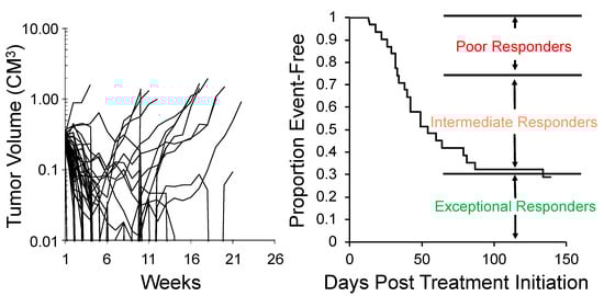 One approach to encompassing genetic diversity for a given cancer type is to use a single mouse testing (SMT) design, rather than conventional experimental designs that use 8–10 mice for control and treatment groups [,]. Validity of the SMT design is based upon a retrospective analysis of 2134 tumor-drug studies undertaken by the PPTP, where the response of a tumor in one mouse, selected at random from the group, was compared to the median group response. This analysis showed that the SMT accurately predicted in 78% of studies. Allowing for a deviation of ± one response classification (e.g., Stable Disease [SD)] versus Partial Response [PR]), the concordance was 95%, Figure 2 (left). Further, the SMT analysis was accurate in identifying the antitumor activity of 66 of 67 drugs in terms of the Objective Response Rate (ORR) determined for each drug over a range of tumor models, Figure 2 (right). Prospective studies with up to 90 ALL models and up to 50 solid tumor models have shown that SMT has similar concordance with conventional testing. Importantly, using SMT one can potentially incorporate up to 20-fold the number of models for evaluation of an agent, encompassing many diseases, or encompassing the genetic diversity of a given disease. Examples of the former design is shown in Figure 3, where the antitumor activity of an antibody conjugate (trastuzumab-deruxtecan; DS-8201a) was evaluated in 35 xenograft models. Tumor sensitivity to DS-8201a varied considerably with some tumors progressing on treatment or having short event-free survival (EFS) as shown by the Kaplan–Meier analysis. As each tumor model is linked to whole exome sequencing (WES) and RNA sequencing (RNAseq), such results can be of value for identification of biomarkers associated with drug sensitivity or resistance. Of note, five models that remained in Complete Response at the end of the observation period (20 weeks), were malignant rhabdoid tumors, perhaps indicating sensitivity of this disease to DS-8201a [].