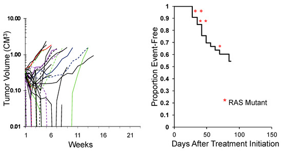 Left: Initial responses of 34 RMS models to Cycle 1 vincristine + actinomycin D + cyclophosphamide (VAC) using the SMT experimental design (ongoing expt.). Right: Kaplan–Meier plot for EFS. Red asterisks: RAS mutant ERMS models.