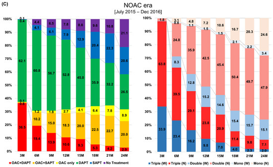 Combination therapy with anticoagulants and antiplatelets has been a major consideration in treatment decisions for patients with atrial fibrillation (AF) who undergo percutaneous coronary intervention (PCI) [1,2]. Guidelines recommend the initial administration of oral anticoagulants (OACs) for stroke prevention in addition to dual antiplatelet therapy (DAPT) after PCI (triple therapy (OACs plus DAPT)) [1,2]. However, the augmented risk of major bleeding associated with combination therapy may counterbalance the treatment benefits [3], and clinicians might be hesitant to administer guideline-based antithrombotic therapy after PCI [4,5]. Therefore, careful evaluation of treatment compliance is important in real-world clinical practice to guide clinicians for optimal management. A nationwide study can provide valuable longitudinal data regarding antithrombotic therapy in patients with AF who undergo PCI, because this information will aid in evaluation of long-term compliance [6]. Since non-vitamin K oral anticoagulants (NOACs) have been the major choice for stroke prevention in AF, a growing body of evidence has reported the outcome benefit of a combination regimen based on NOACs for patients with AF undergoing PCI [7,8,9,10]. Therefore, for those eligible for NOACs, guidelines recommend NOACs in preference to vitamin K antagonists (VKAs) in a combination regimen with antiplatelet therapy after PCI [1,2]. The current study was purposed to investigate whether the updated guidelines have changed the long-term treatment patterns in antithrombotic therapy among the AF population after PCI.