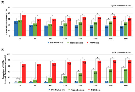Comparison of prescription rates of overall oral anticoagulants and non-vitamin K oral anticoagulants between the study cohorts. The figure shows the prescription rates of OACs (A) and the proportions of NOACs in overall OACs prescriptions (B) compared between the three cohorts in every 3-month time interval. In each period, the prescription rates of OACs and the proportions of NOACs were significantly increased from pre-NOAC to NOAC era. OACs: oral anticoagulants; NOACs: non-vitamin K oral anticoagulants.