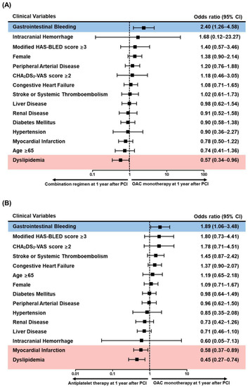 Clinical factors associated with preference for oral anticoagulant monotherapy compared with combination regimens or antiplatelet-only therapy 1 year after percutaneous coronary intervention. Among the clinical factors, previous gastrointestinal bleeding was associated with a preference for OAC monotherapy over combination regimens, whereas dyslipidemia was associated with a preference for combination regimens (A). Previous gastrointestinal bleeding was also associated a preference for OAC monotherapy than antiplatelet-only therapy. However, previous MI and dyslipidemia were associated with a preference for antiplatelet-only therapy (B). CI: confidence interval; OAC: oral anticoagulant; PCI: percutaneous coronary intervention.
