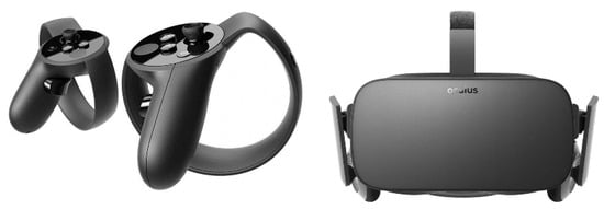 To build the VR-CET program, the original investigators collected data on the most common binge-eating cues (e.g., foods and environments) reported by patients with eating disorders [,]. Using virtual reality, they assessed the validity of these foods and environments in terms of eliciting craving and anxiety responses []. For the present study, food choices included in the original protocol were adapted for food preferences common to a U.S diet (e.g., baked fish was changed to a hamburger; see Supplementary Table S1 for our final food list). In addition, the environments, such as the bedroom and diner, were tailored to U.S. norms. However, the total number of foods (30) and environments (4) included in the program were unchanged. These environments were used throughout the therapist-assisted VR-CET sessions. The software used was a Unity-powered manual build of our VR-CET program, created by two study-hired engineering and development companies using research funds. The program was run through VR-compatible MSI laptops and was launched through Steam VR. To view the VR program, participants used the Oculus Rift (HMD), Oculus sensors, and Oculus controllers (see Figure 1).